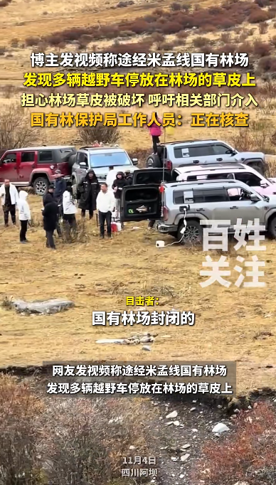 据百姓关注报道,11月4日,四川阿坝一网友发视频称途经米孟线国有林场,发现多辆越野车停放在林场的草皮上。